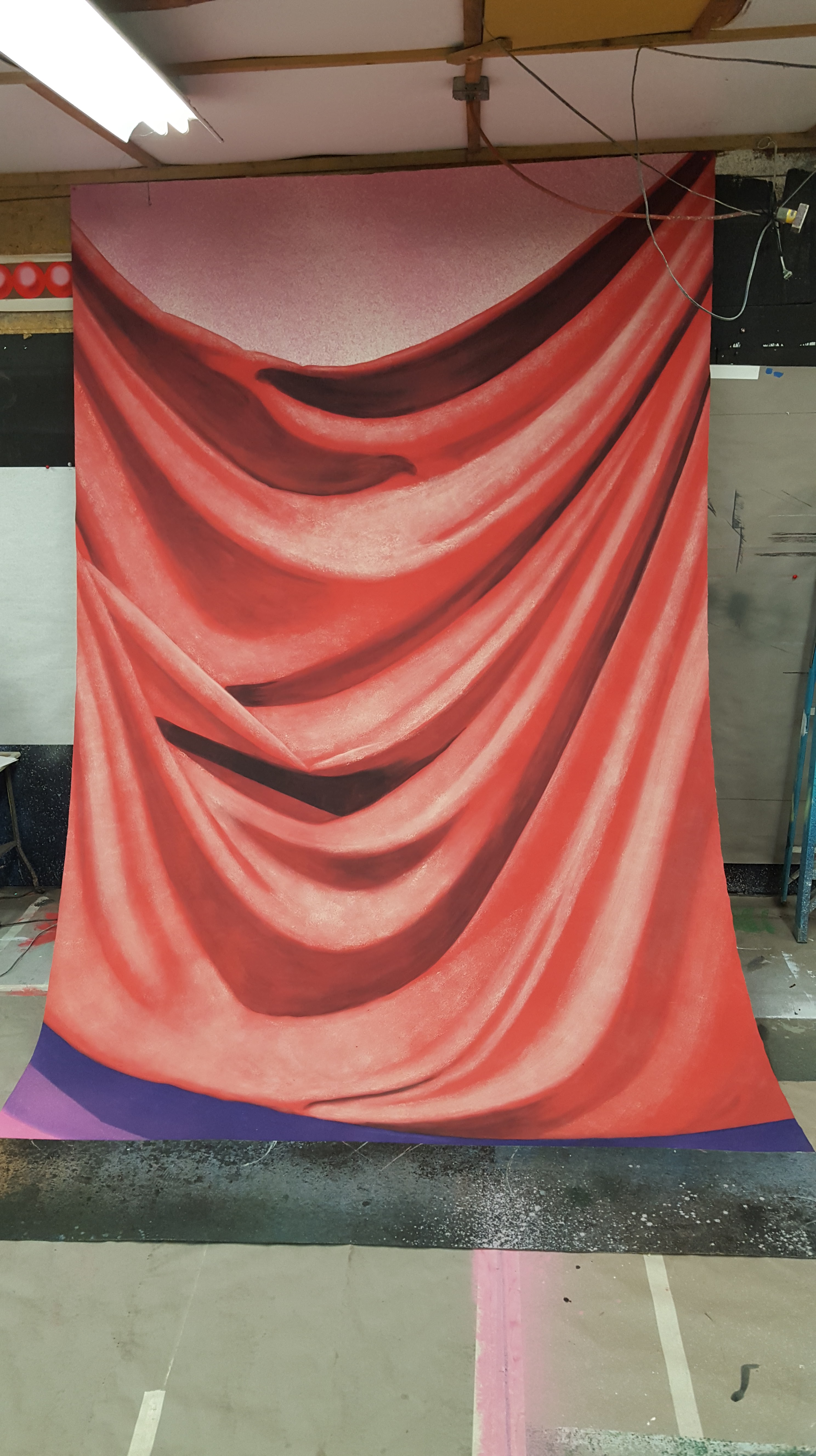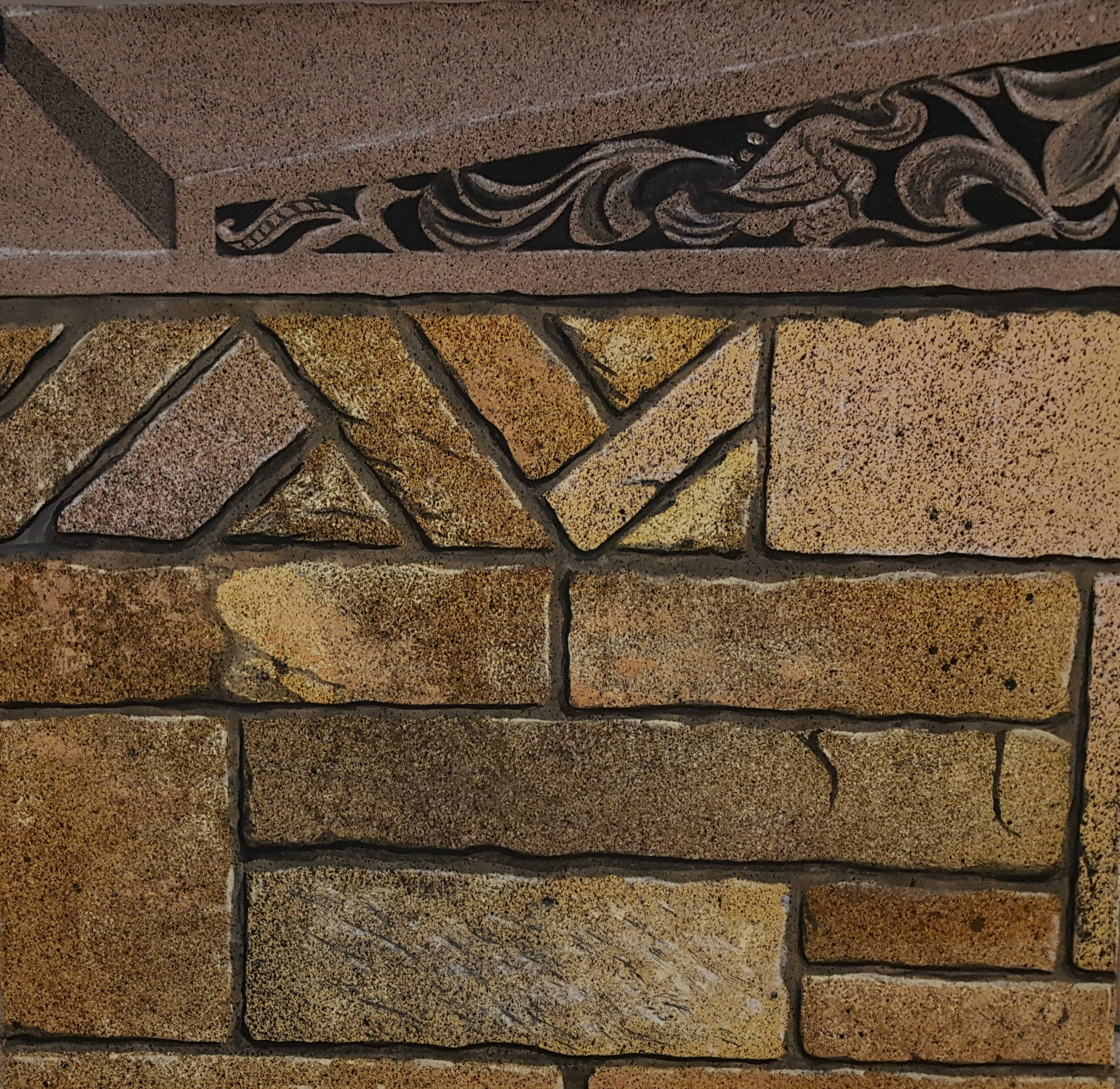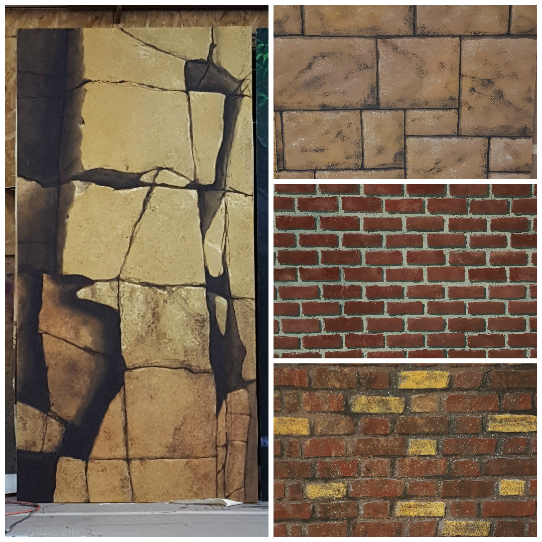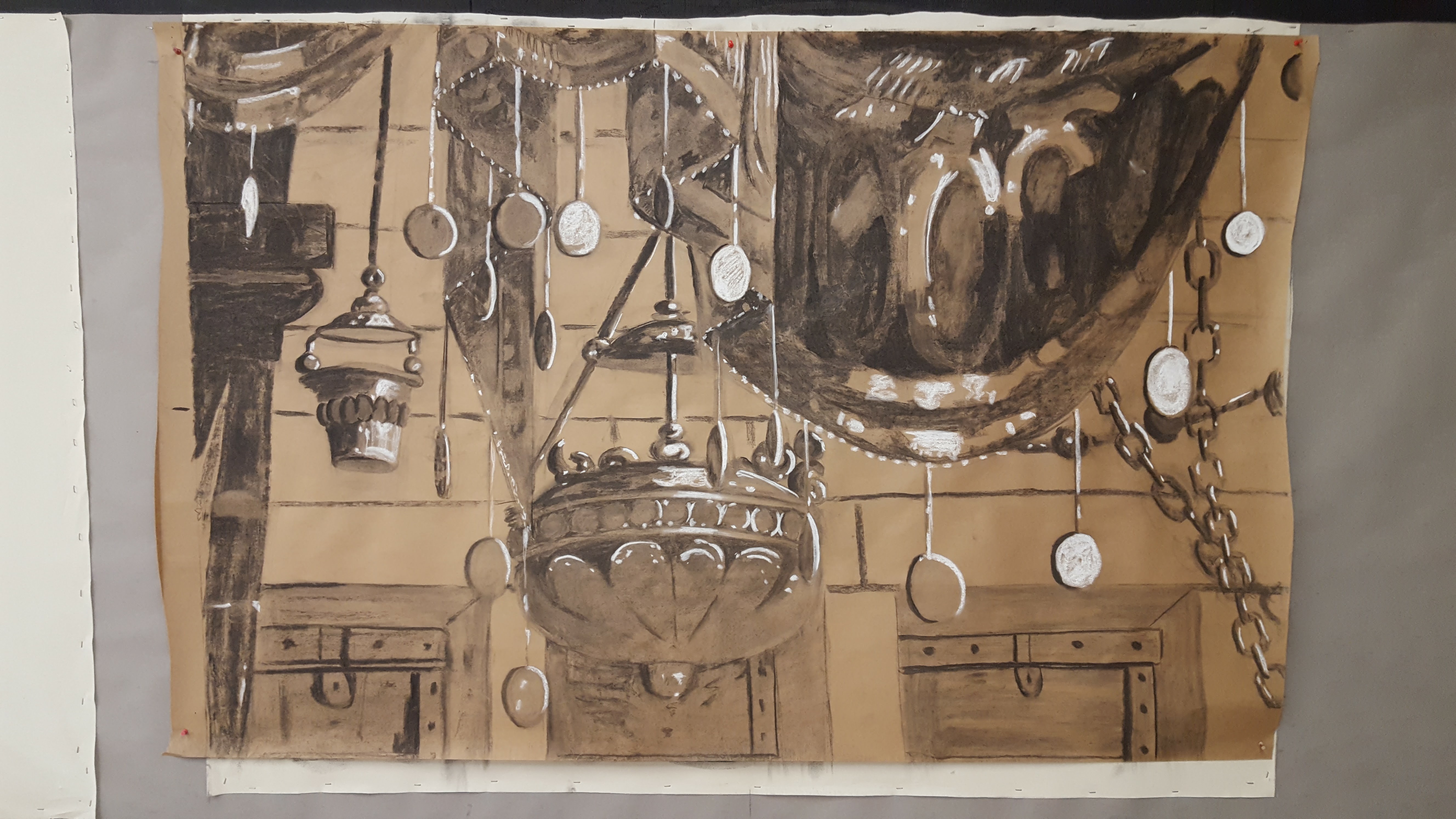 Scenic Art Techniques – Basic Sculpture and light study (3-D on left, 2-D on right) Light and shadow study on varied surfaces Charcoal and chalk value study Drapery, 2016, Charcoal on Paper, 2' x 3' Interior Marble samples Interior Wood-grain samples