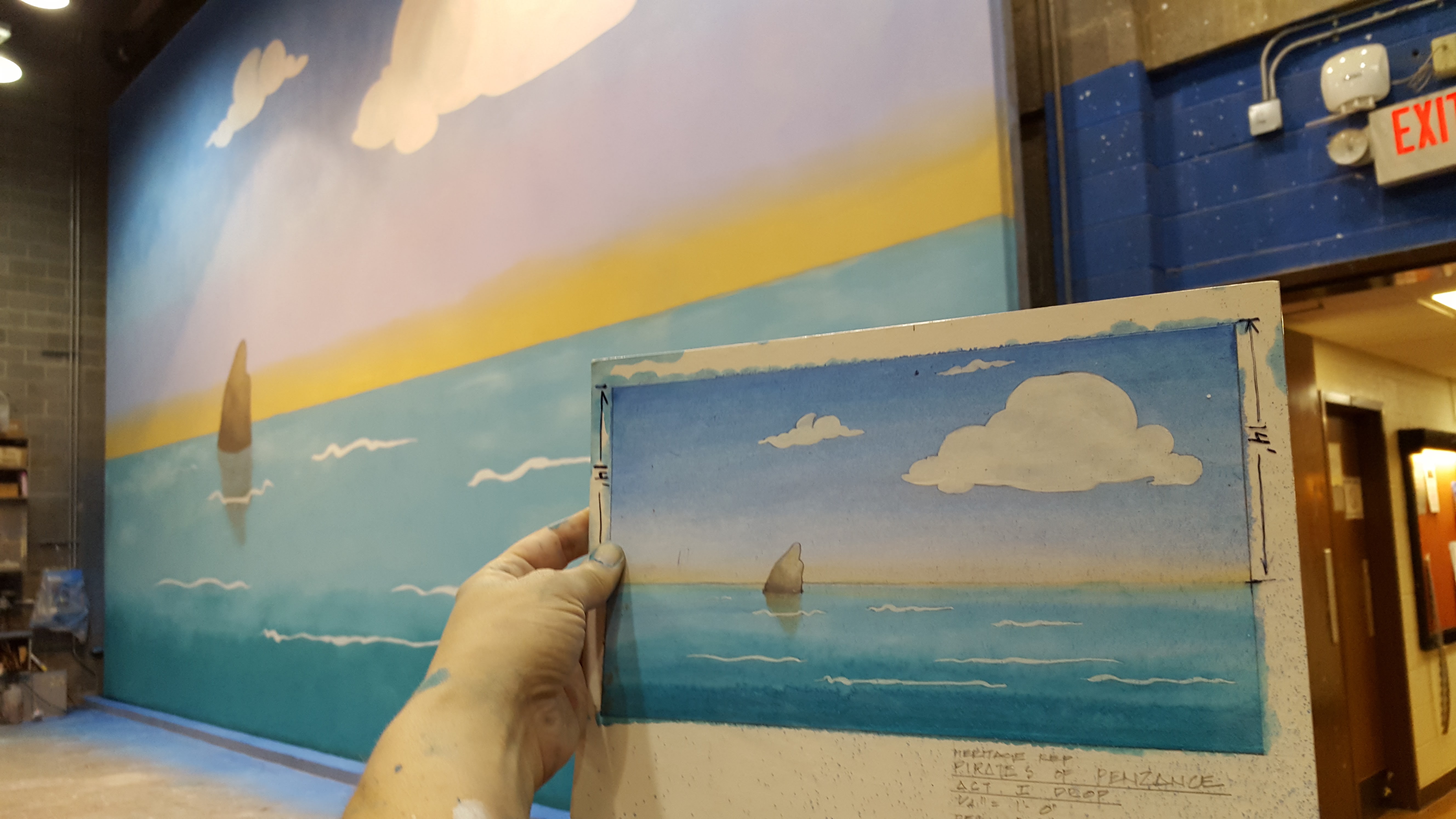 The Pirates of Penzance Process for the Act II drop (translucent) I painted the mermaid, and was part of a team of 6 that did the rest of the boat I was lead on this drop with a team of 4 scenics Rock wagon (carved from bead foam, covered in scenic goop and cheesecloth, painted with brush and pneumatic sprayer I painted the pirate The Pirates of Penzance Heritage Theatre Festival Assistant Scenic Charge Designer: Bill Clark